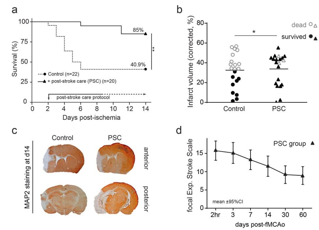 Kaplan-Meier survival plot (a) shows that the appropriate post-stroke care (PSC group) doubled the 14-day survival rate compared to control mice. Importantly, it rescued animals with large infarcts (b) (infarct volume >35% of hemisphere, PSC group black filled triangles), without ameliorating their infarcts on day 14. Representative MAP2-stained brain sections (c), showing left hemispheric infarct (white tissue in the left hemisphere) and atrophy. Evidently, animals with large infarcts do not die when supported by PSC and have a chronic spontaneous recovery of approximately 40% (d) (focal Experimental Stroke Scale), which models the corresponding clinical status (78). The horizontal lines in b represent the mean values. *p<0.05; **p<0.01.