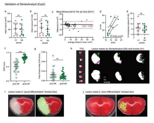 Figure 3. Results of SA on the validation experiment (Exp2) compared to manual volumetry. The infarct volumes measured by SA in mm3 (a) or as % percentage of left hemisphere (b) are similar to that of manual volumetry (h1). Bland-Altman plot for infarct volumes per single slices (c) shows an almost zero bias by SA compared to h1. Infarct volumes (as % Vinf) again correlate well to fESS values per animal (d). Hemispheric edemas as % percentage are also similar to human measurements (e). Dice-scores (f) and false positive rates (FPR, g) for SA- versus h1-masks, categorized per quality of TTC-staining (poor/good differentiation), show again that SA performs better in good differentiated TTC-slices. SA consistently has a very low FPR rate in both poor and good "differentiated" slices, indicating high specificity for infarct lesions. Representative overlay-projections (white) of SA (green) and h1 (pink) masks are shown in (h). Representative TTC-slices with good and poor color differentiation between infarcted and healthy tissue, with their corresponding SA lesion masks, are shown in (i) and (j) respectively.